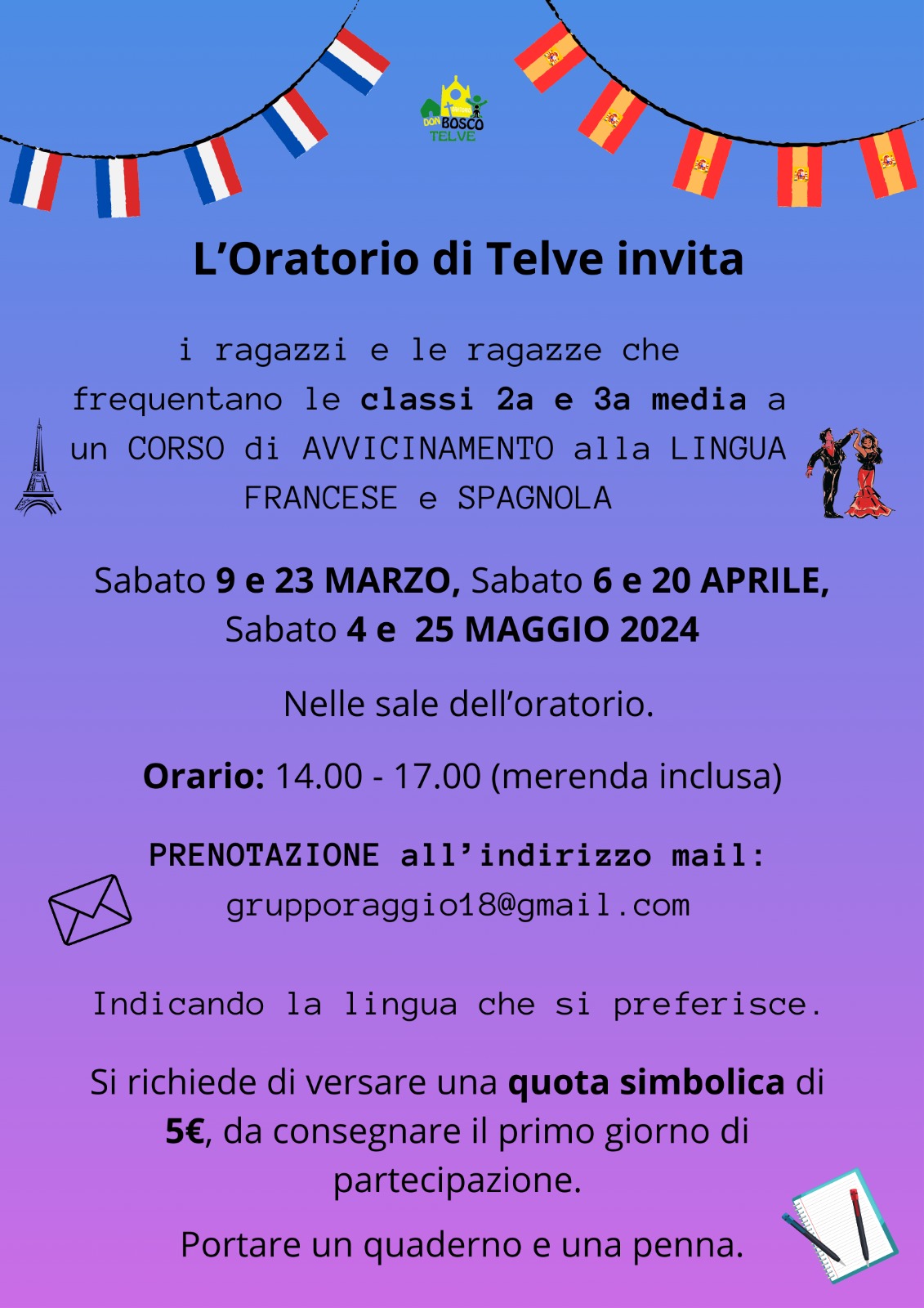 Quest’anno l’oratorio don Bosco di Telve propone un laboratorio linguistico rivolto a ragazzi e ragazze delle seconde e terze medie!