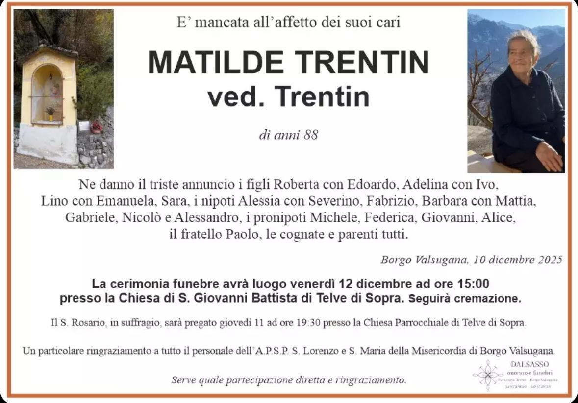 Parrocchia di Telve di Sopra:  Matilde Trentin ved. Trentin di anni 88- funerale 12/12 ore 15,00 – seguirà cremazione – Rosario giovedì in chiesa alle ore 19,30