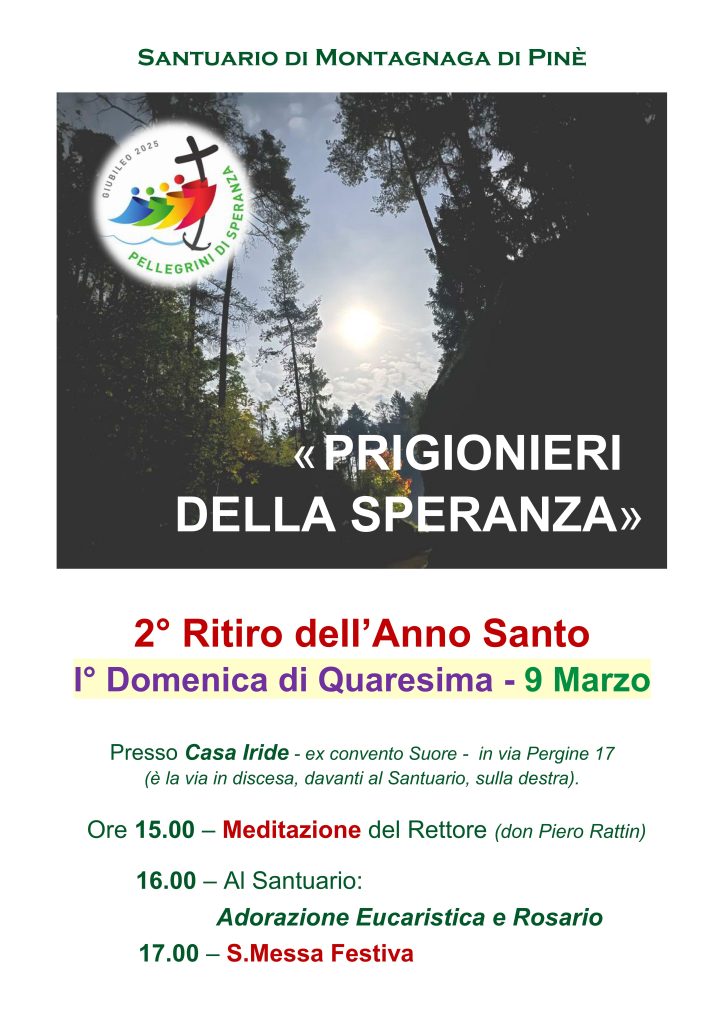 Ecco qui sotto la locandina del secondo ritiro Spirituale a Pinè in occasione dell’anno Santo: