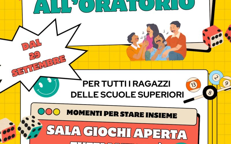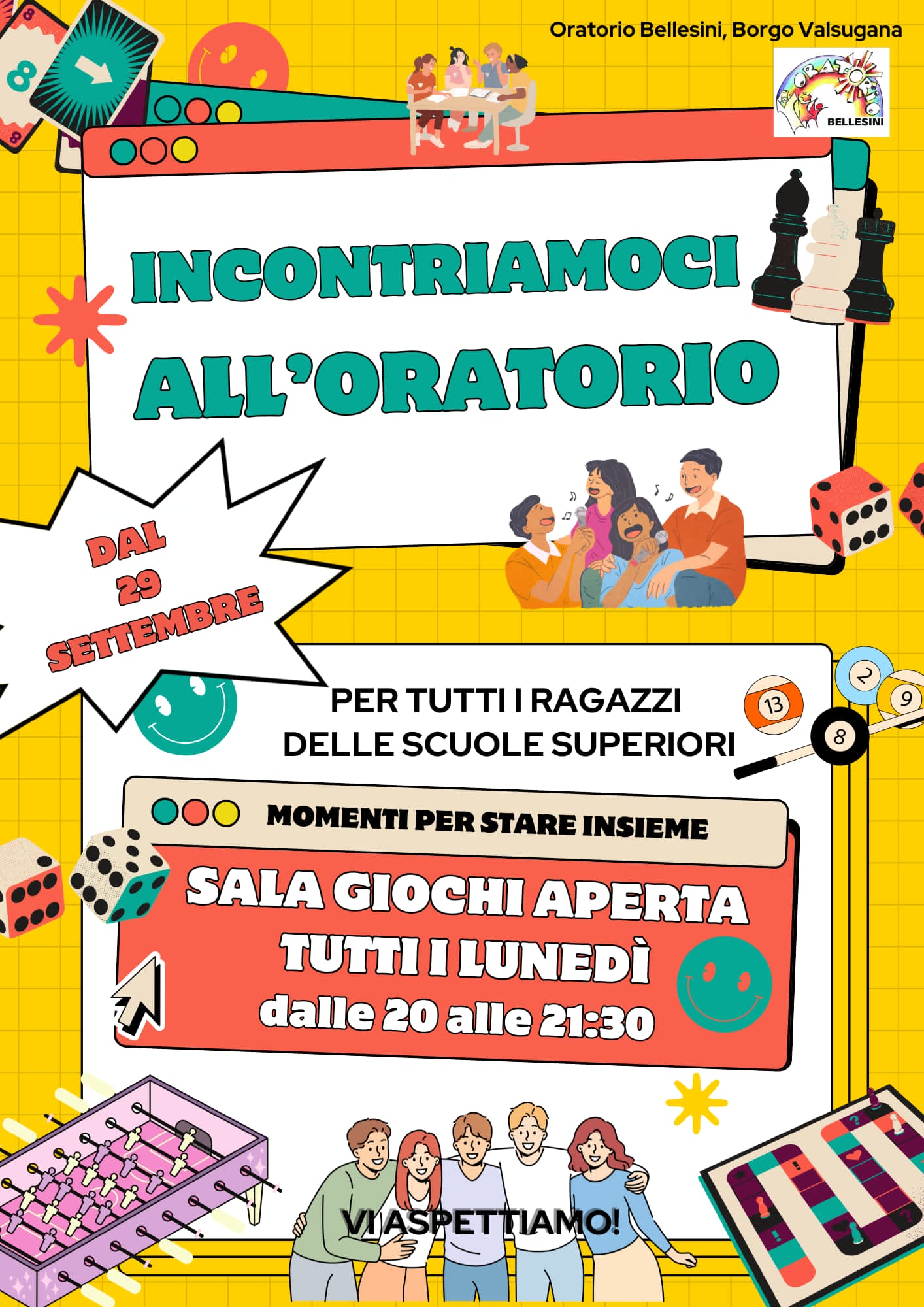 Tutti i lunedì dalle 20 alle 21.30 la sala giochi dell’oratorio di Borgo è aperta per i ragazzi delle superiori! Buon divertimento!