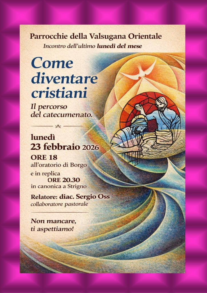 Ogni ultimo lunedì del mese viene offerto un agile incontro di approfondimento per adulti su temi vari religiosi e di attualità. Alle 18 all’oratorio di Borgo e in replica alle 20.30 in canonica a Strigno